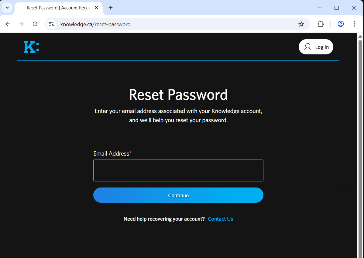Enter the email address you used when you first created your Knowledge Account, then click “Continue”.