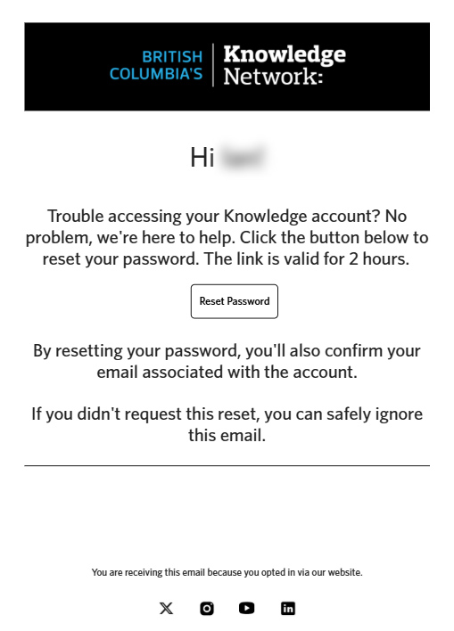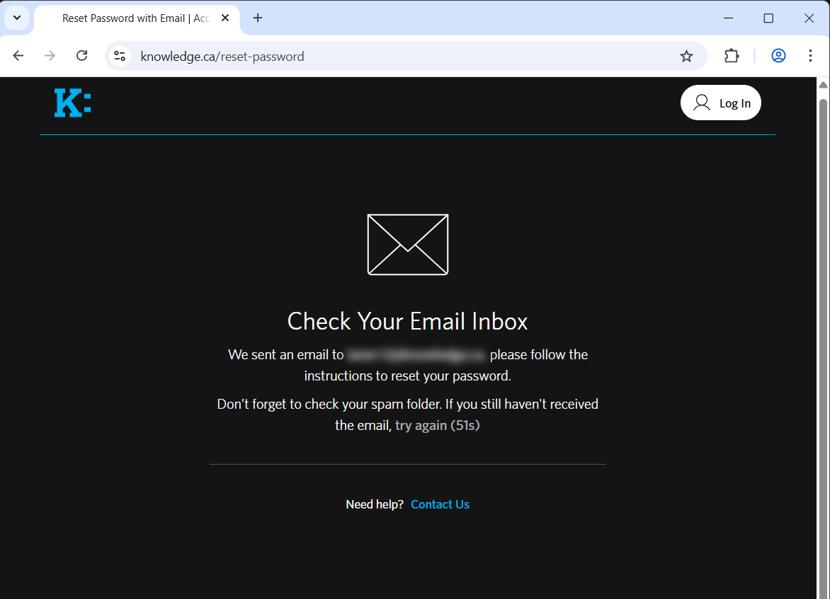 You’ll see a message asking you to check your inbox for instructions. Look for an email from Knowledge with the subject line “Reset your Knowledge Password”.